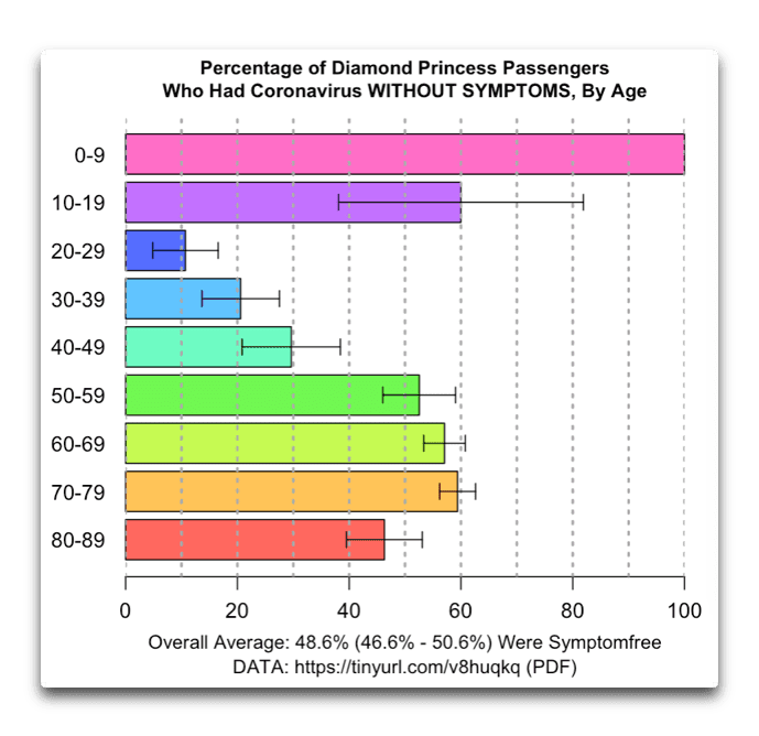 Zostawmy jednak zamożność i skupmy się na wieku. Na Diamond Princess była niewielka populacja dzieci i młodzieży, natomiast osoby powyżej 69 lat stanowiły aż 33 % wszystkich pasażerów ogółem. Nie jest to zatem typowa struktura demograficzna, z jaką mamy do czynienia w innych krajach.